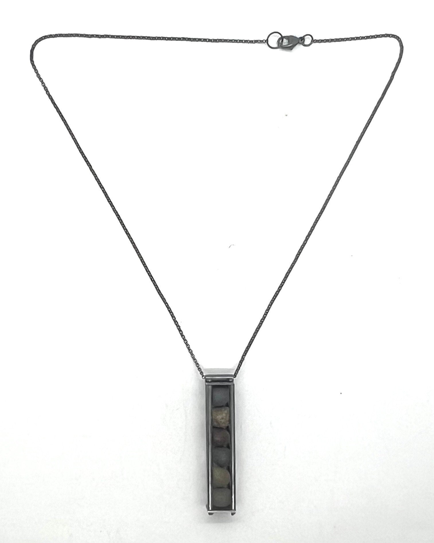 This pendant is a handmade sterling silver cage filled with 6 small rocks of varying colors trapped inside. They can roll around a bit. It is on a sterling rolo chain with a lobster clasp.