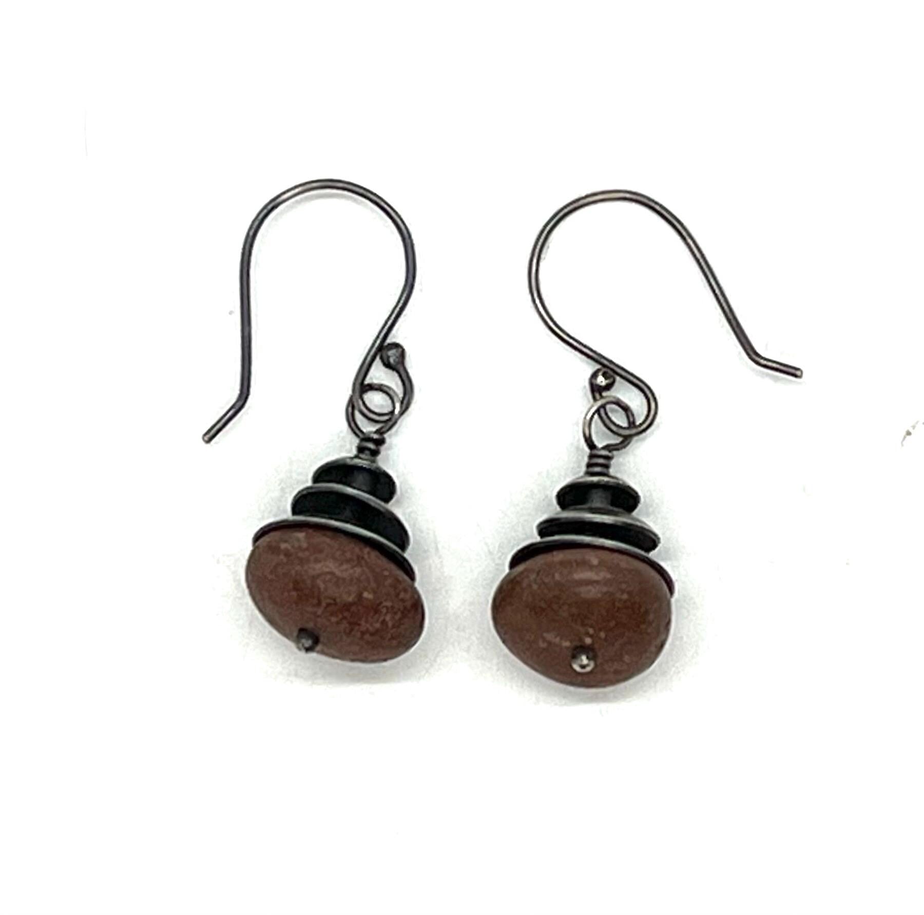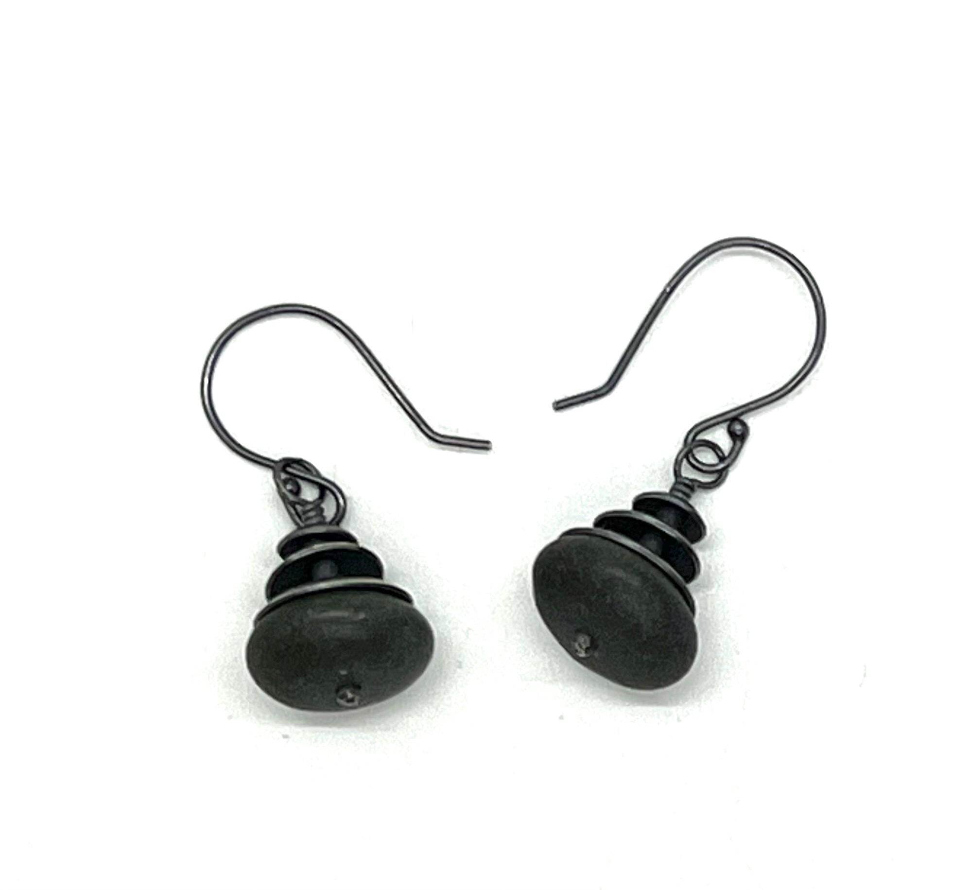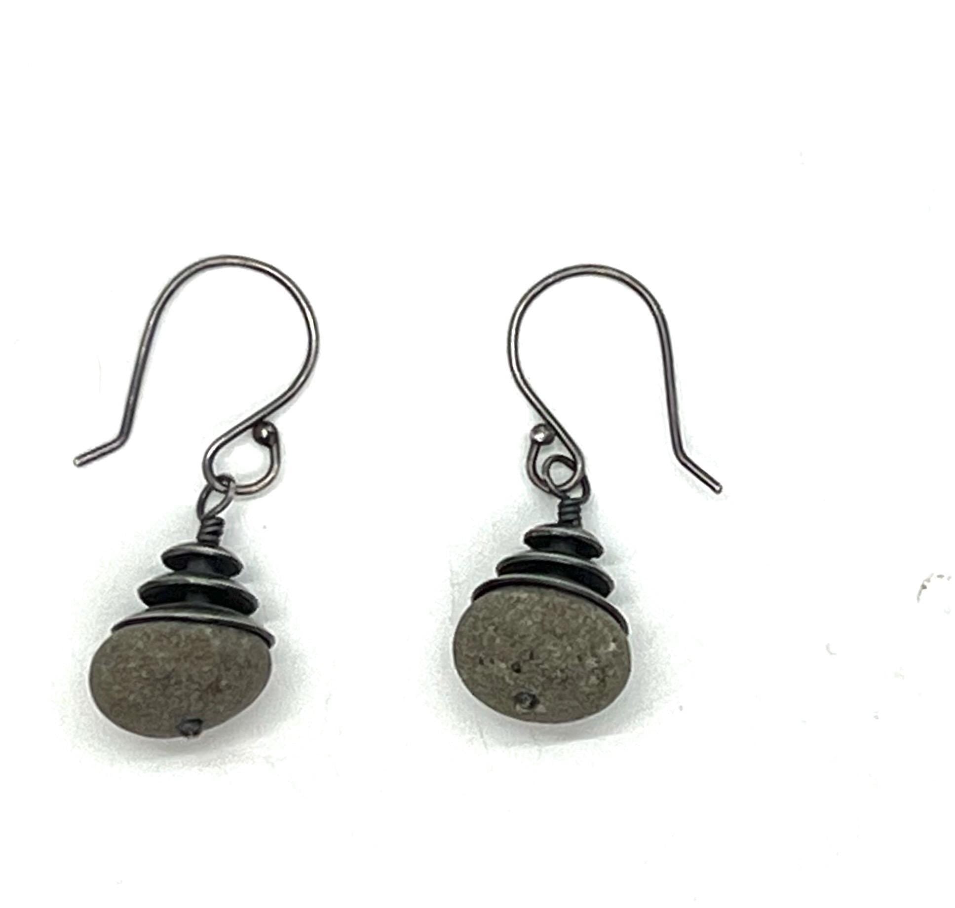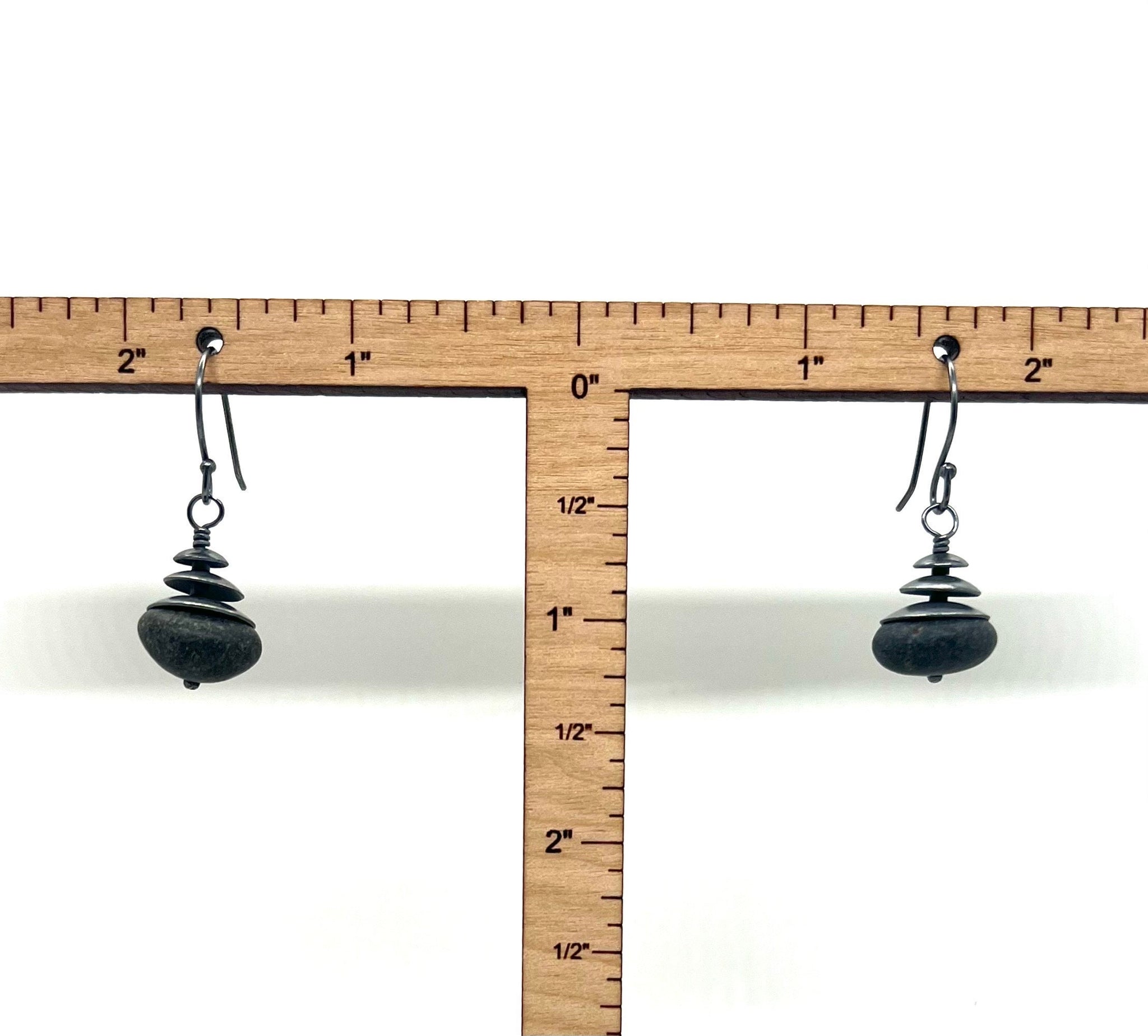These earrings have three saucer shaped discs stacked on top of a dark grey rock. The earwires are sterling silver and handmade.