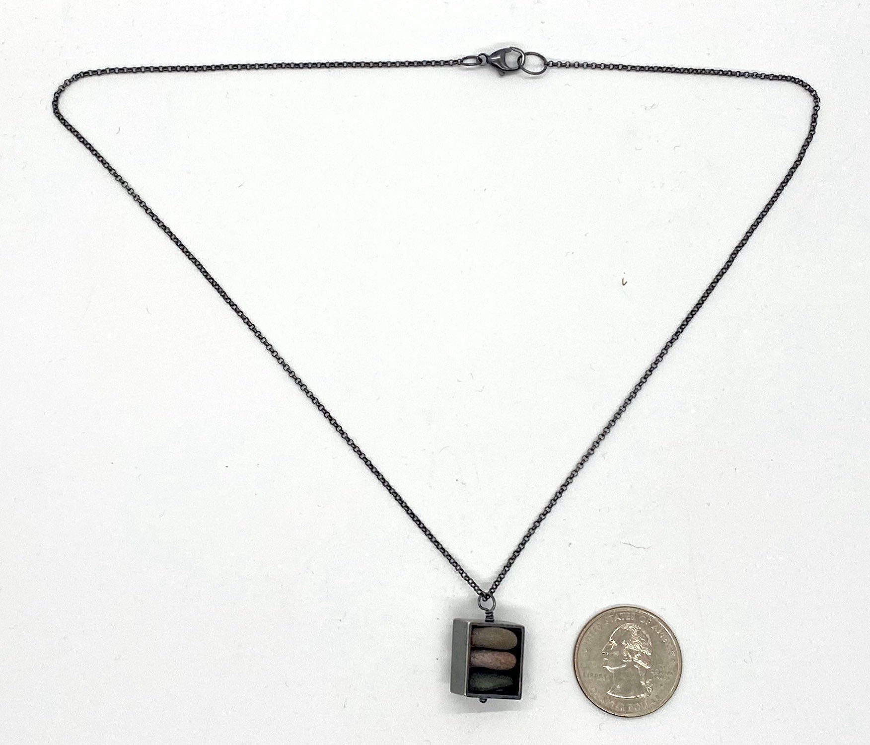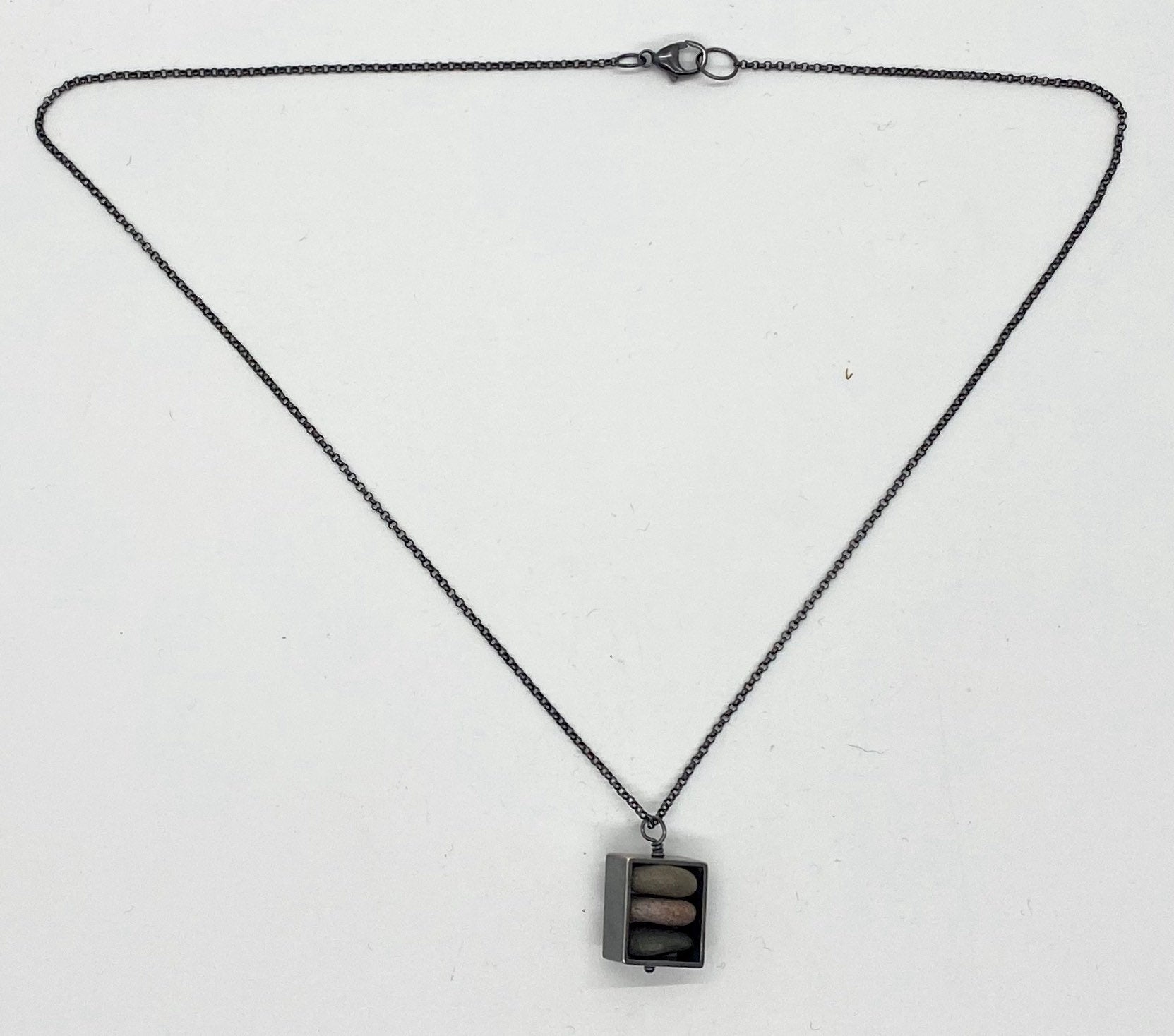 This pendant is a sterling silver box filled with 3 small rocks of varying colors. It is on a sterling rolo chain.