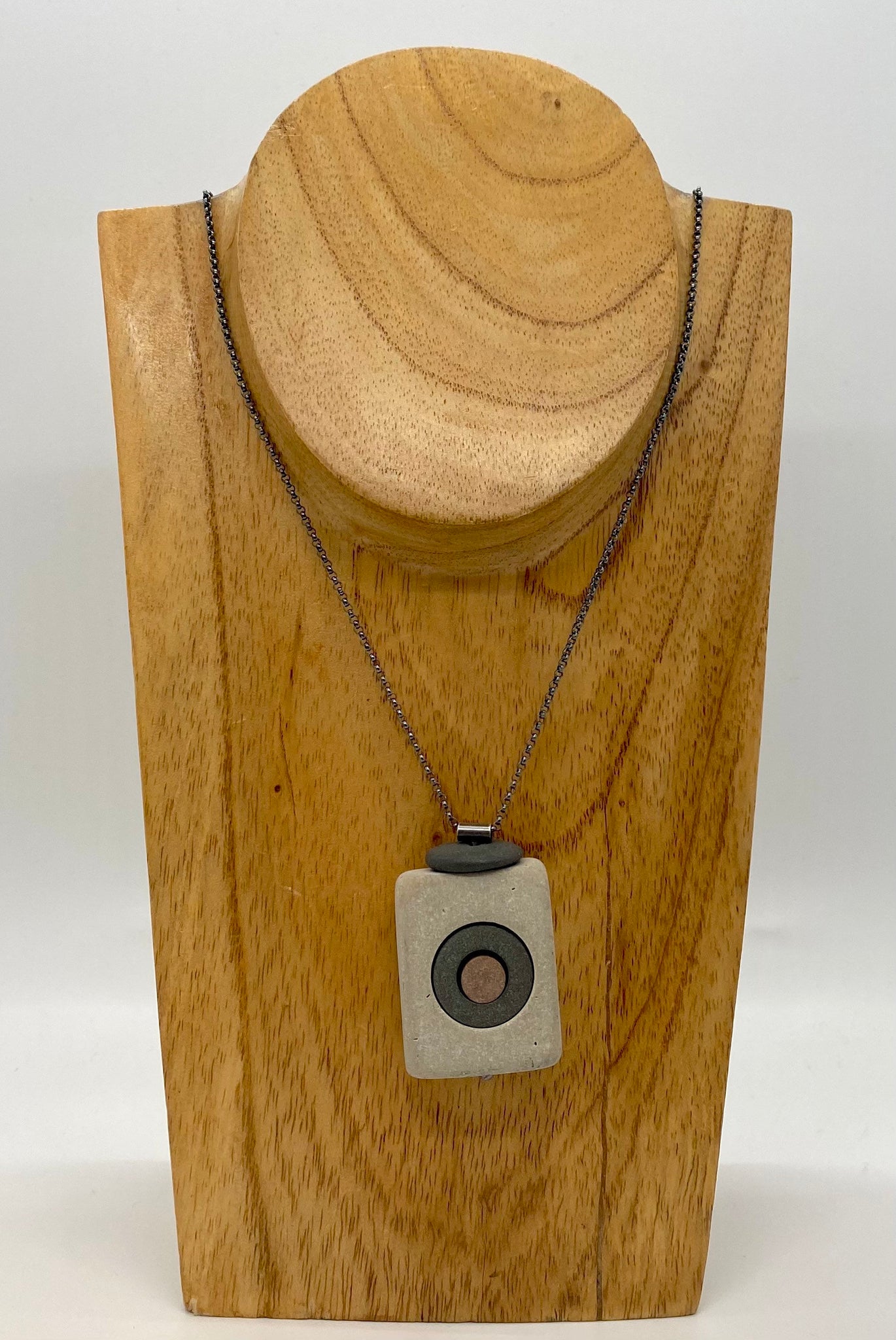 This piece is made with stones from Lake Superior and sterling silver. The silver is oxidized to get the grey color.