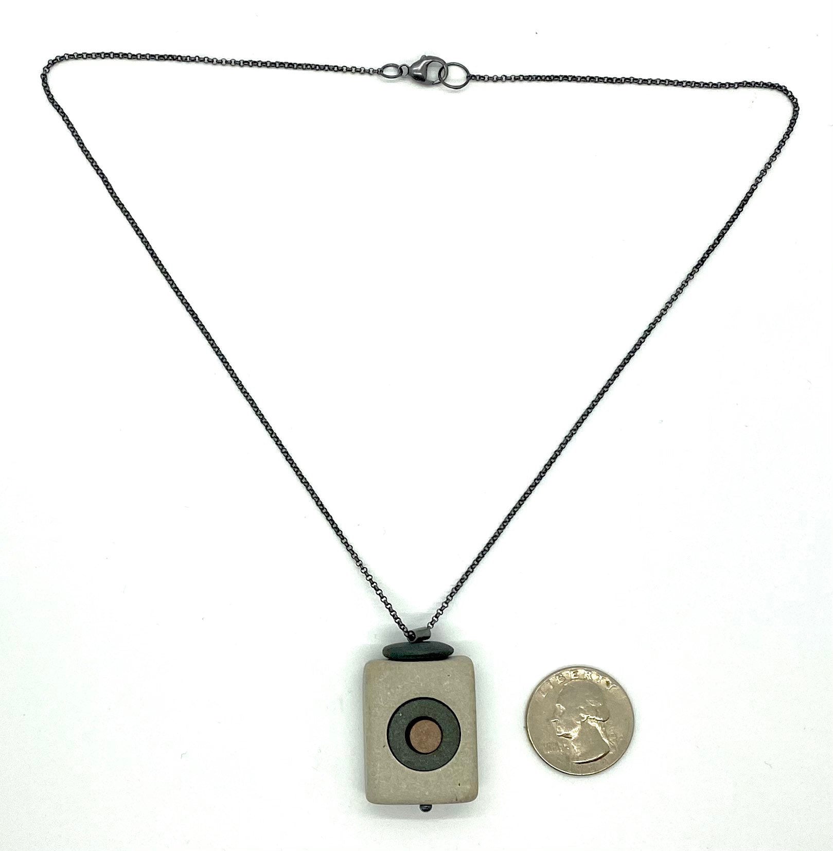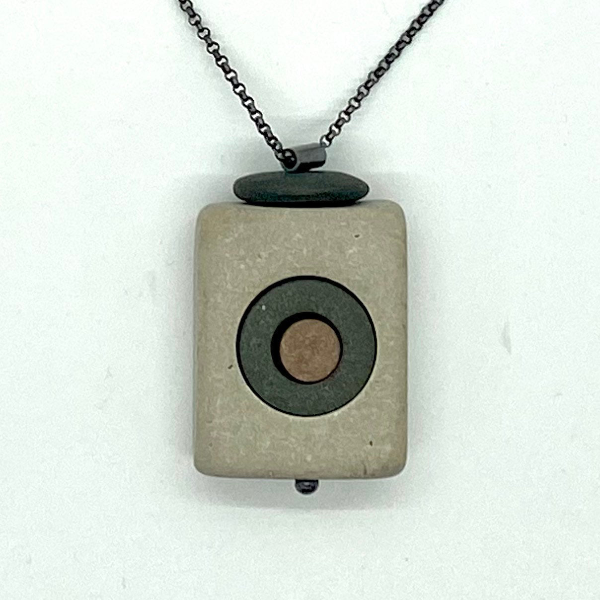 This pendant is a cram colored rock that we have cut into a square shape and tumbled, drilled. It is filled with the inside of two other rocks. It is on a silver rolo chain with a lobster clasp.