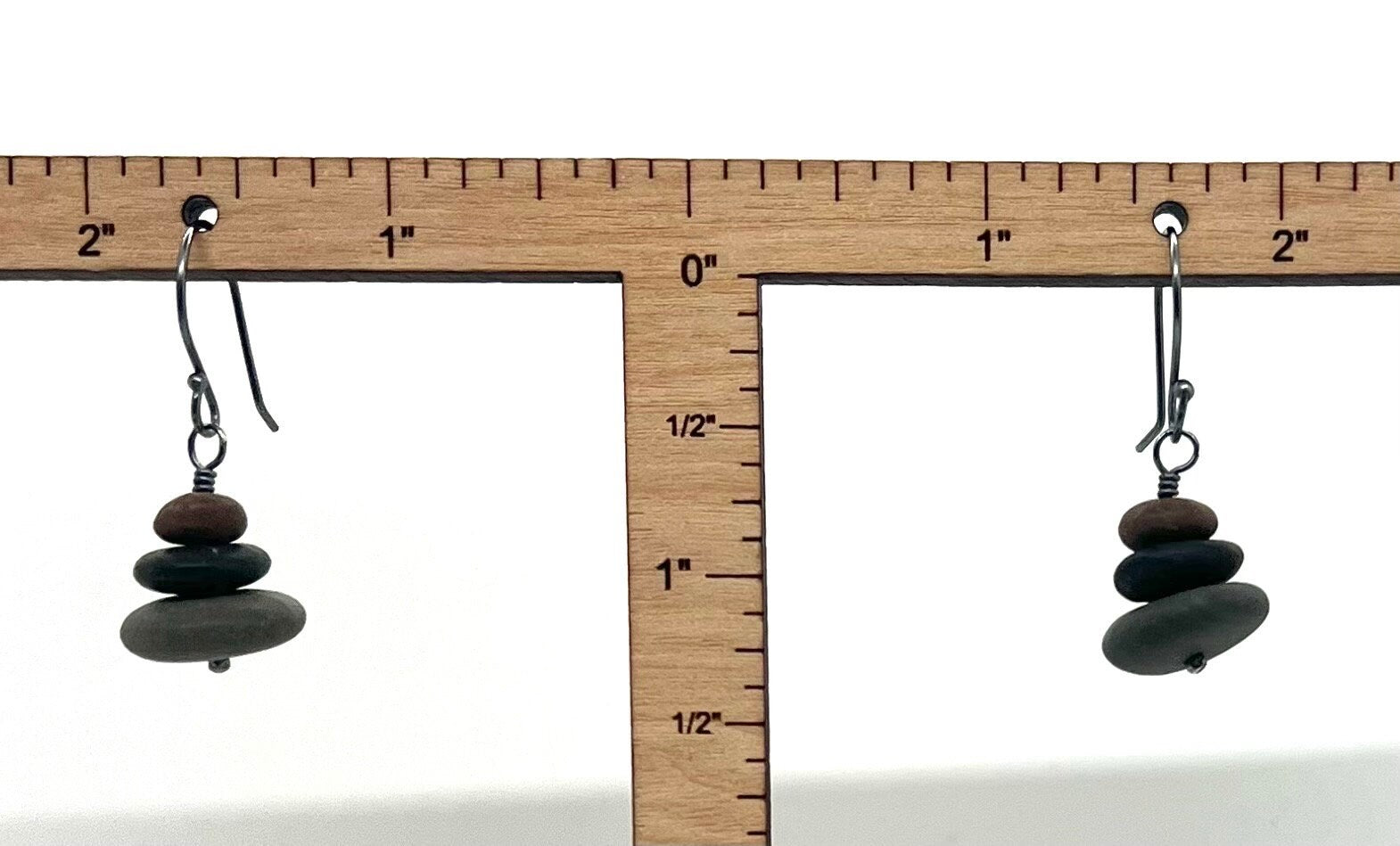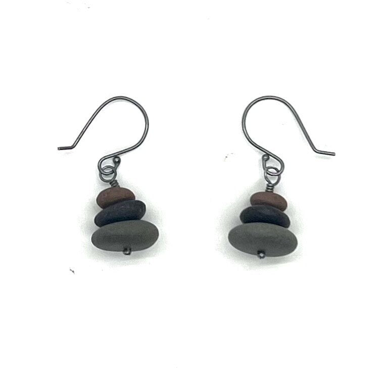 These earrings have three rocks, a light grey, dark grey and a reddish brown, stacked on a pin. The earwires are sterling silver and handmade.