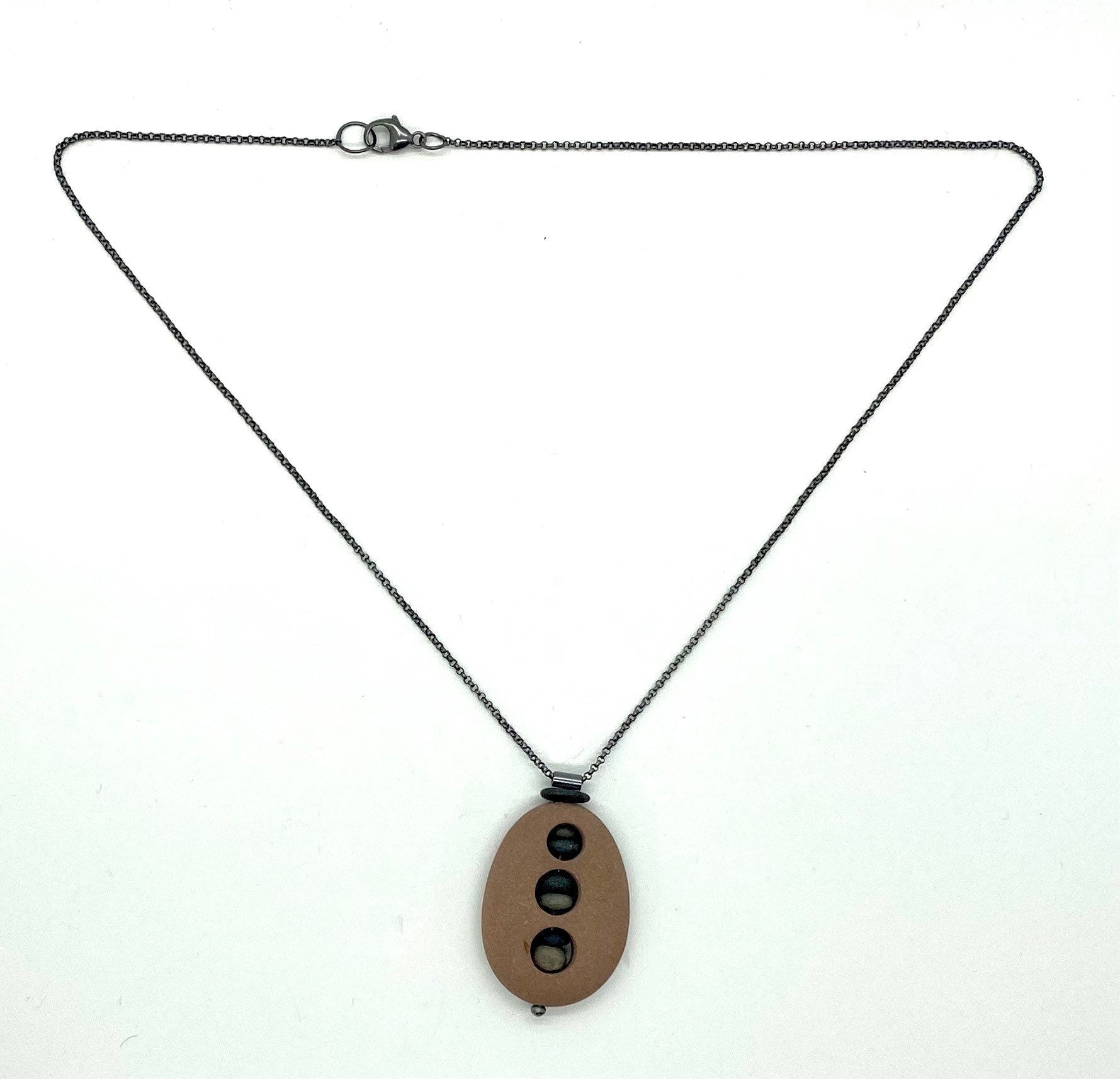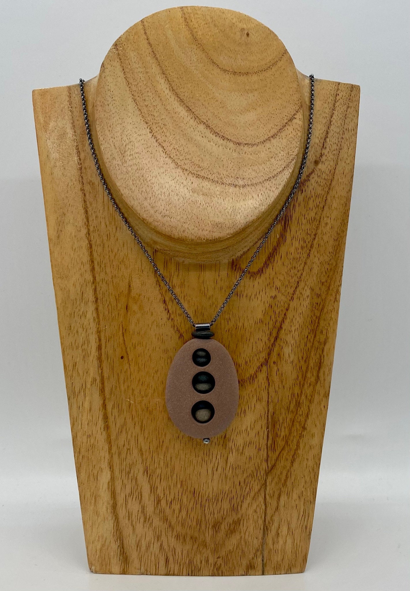 This pendant is a pinkish colored rock , with three holes with multi colored rocks stacked inside those holes. It is on a sterling silver rolo chain with a lobster clasp.