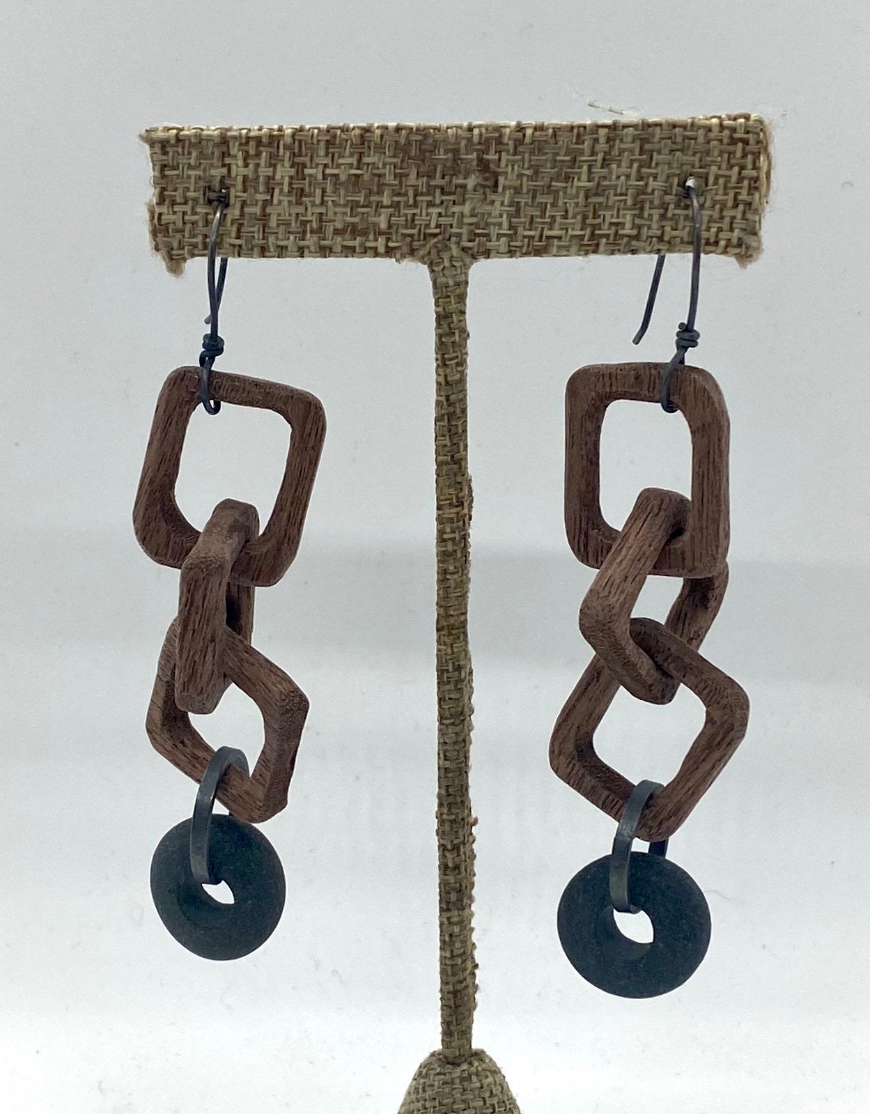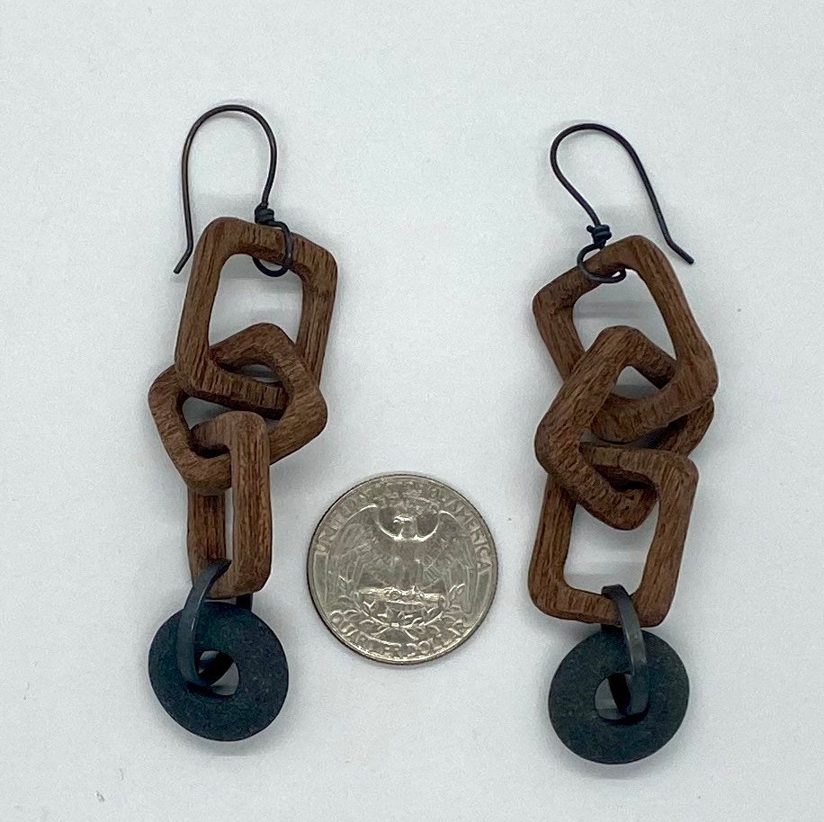 These earrings are a bit different. This is oak I think, not driftwood. To be honest, I can’t remember what kind of wood it is. I carved the chain out of one piece of wood. They then have a dark grey rock on the bottom. The earwires are sterling silver and handmade.