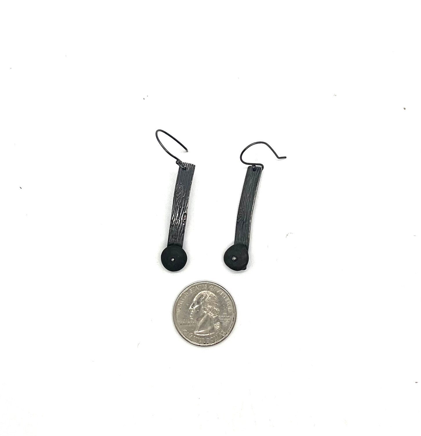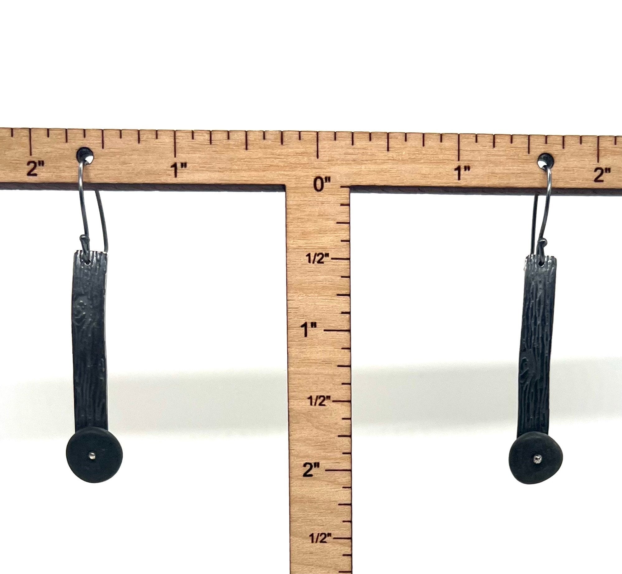 These rocks are dark grey and smooth. They are pinned onto a this strip of silver that has been roller printed with a wood grain pattern. The earwires are sterling silver and handmade.