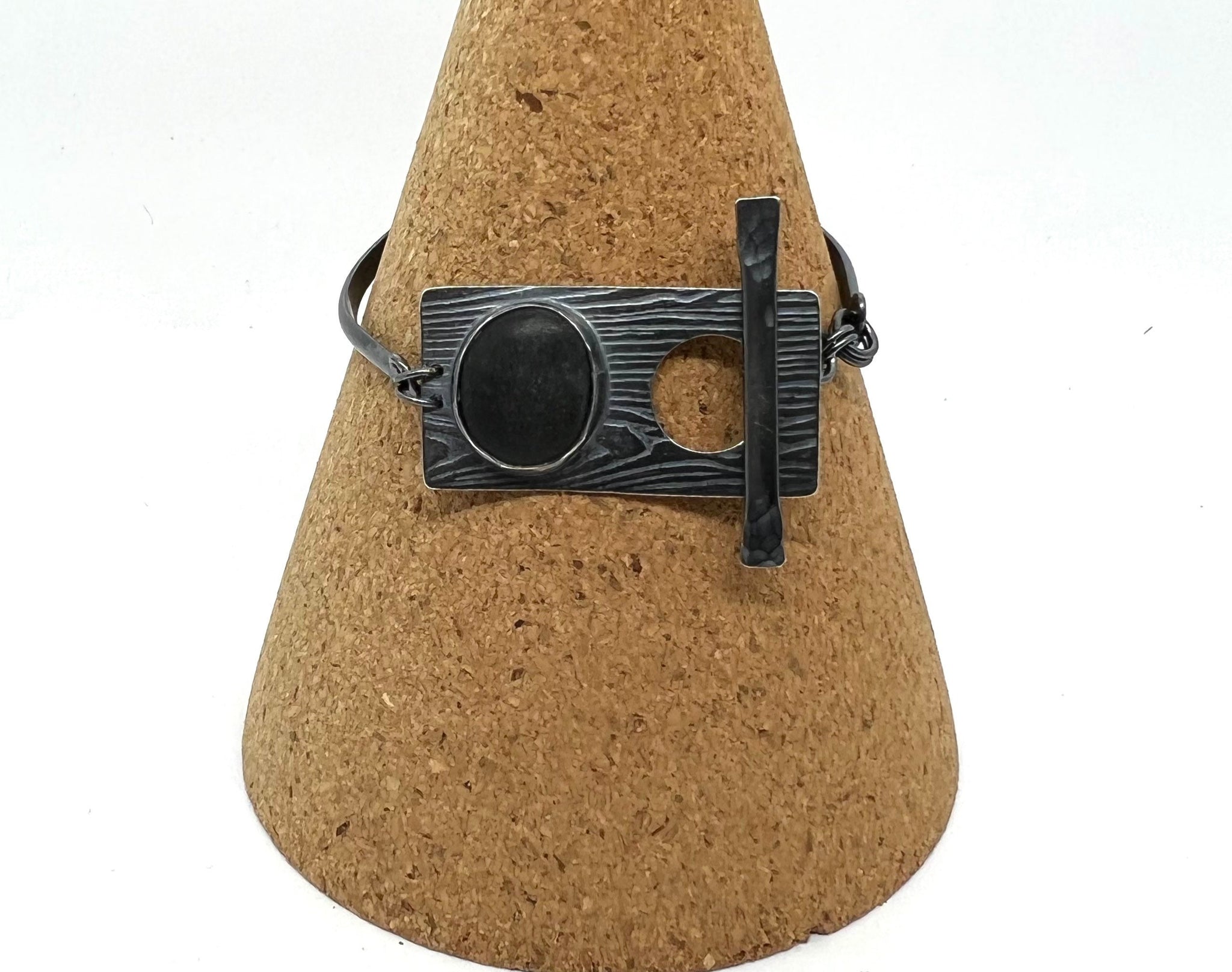 This bracelet has dark grey rock, bezel set on a rectangle that has a wood grain pattern on it. It has a toggle clasp.